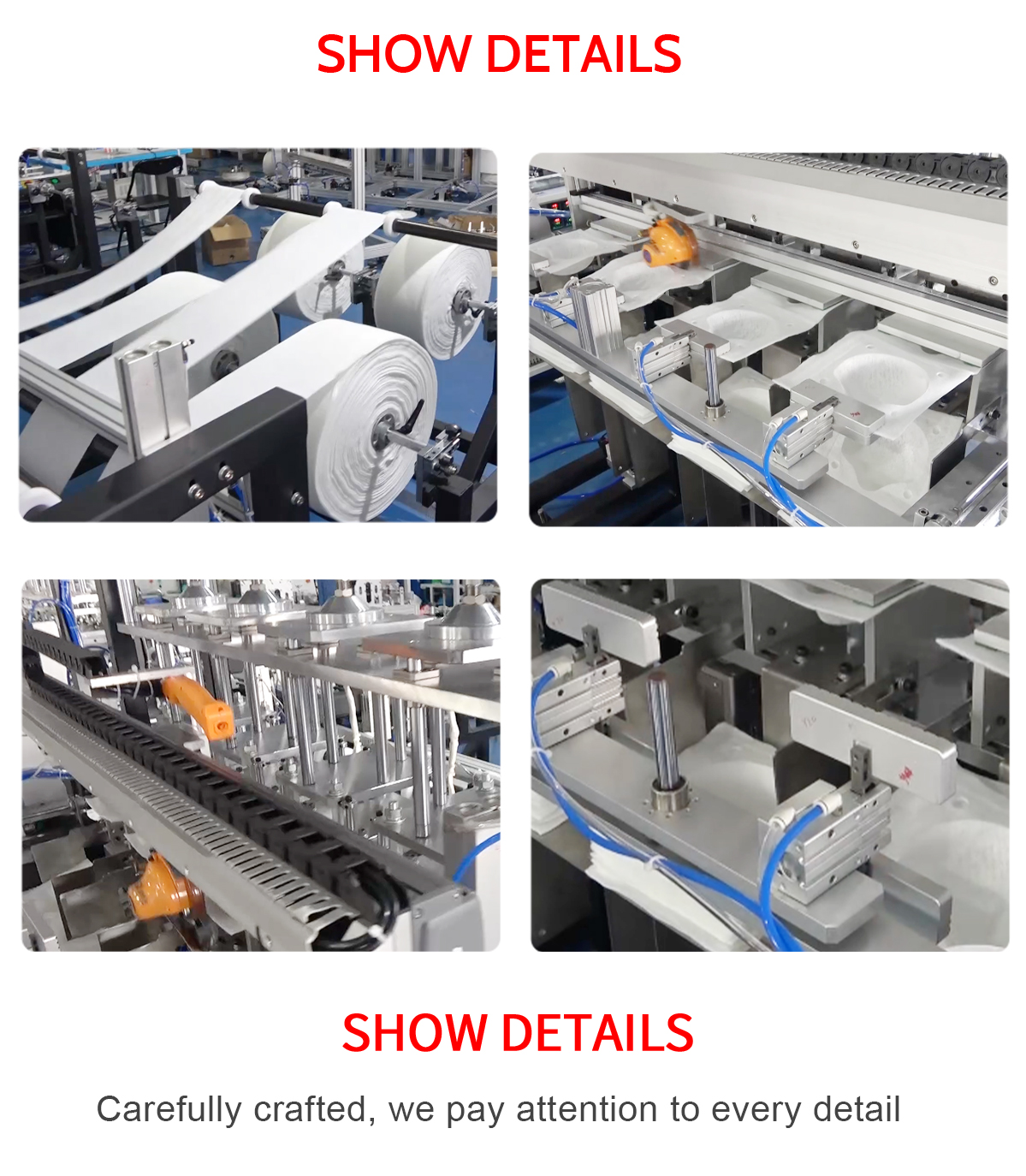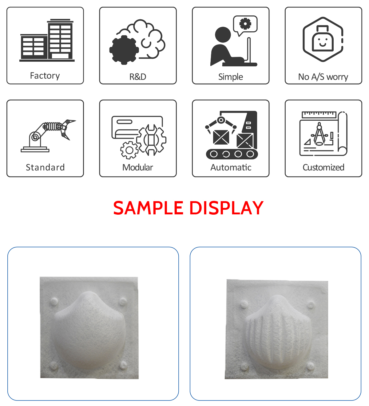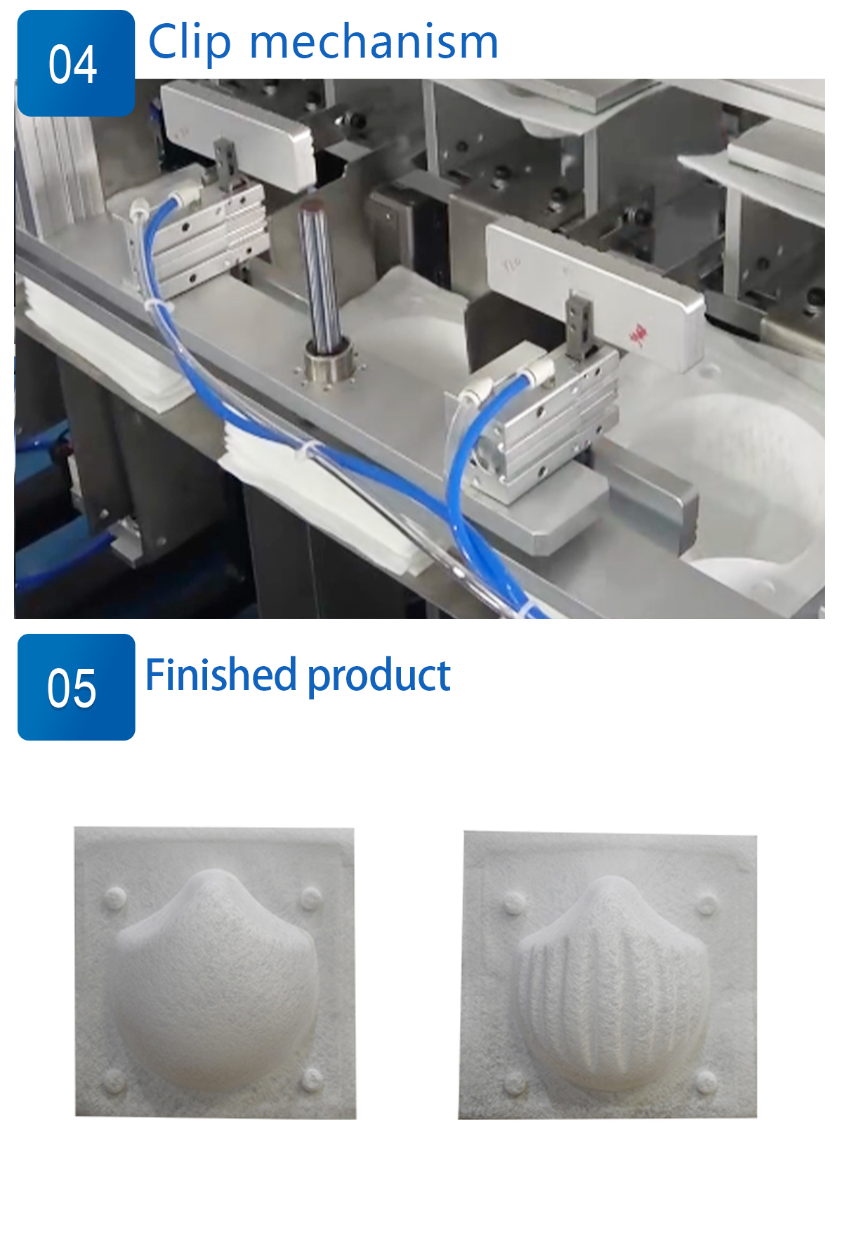 This machine uses ultrasound to form cup shaped mask automatically. It can produce 6masks each time. 3-5 workers can be saved with the machine doing all work like feeding,forming, cutting and discharging.