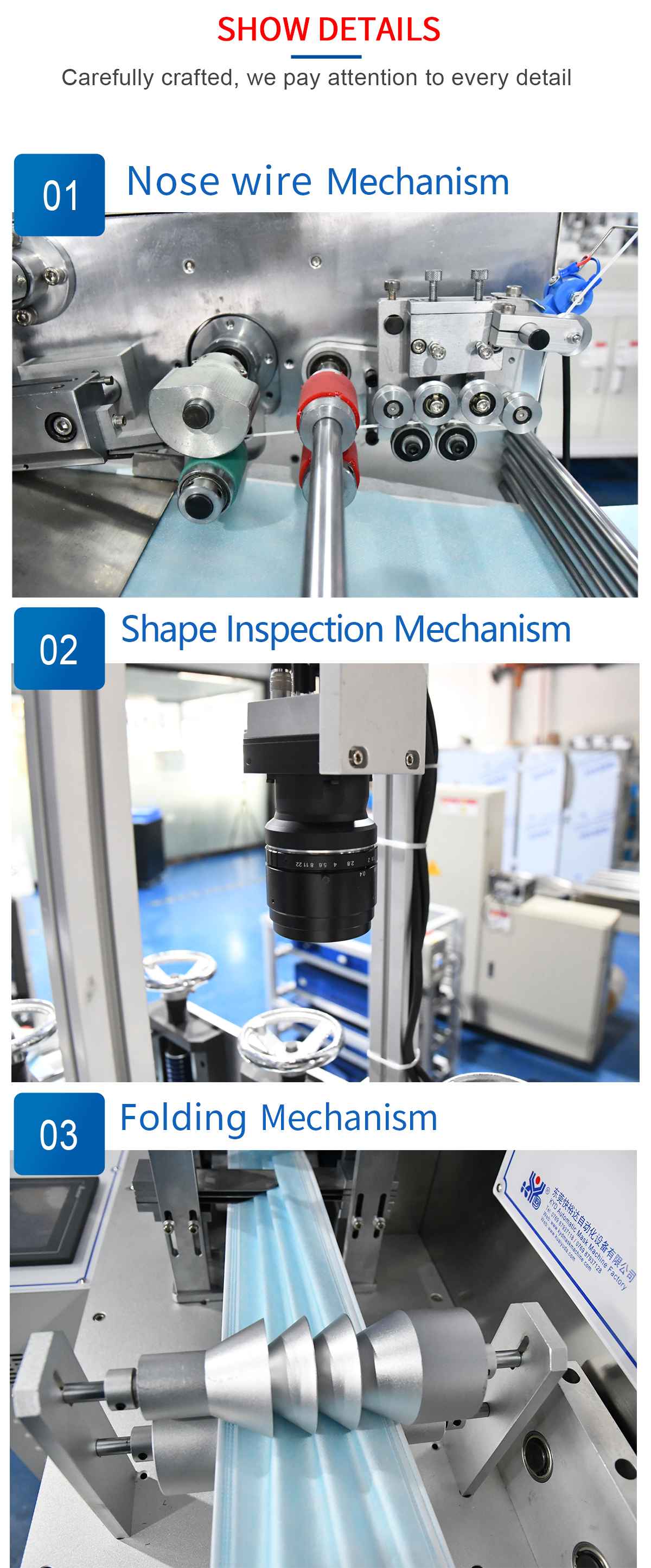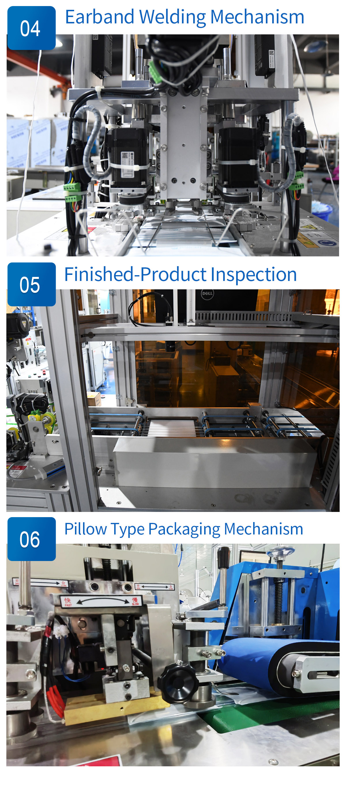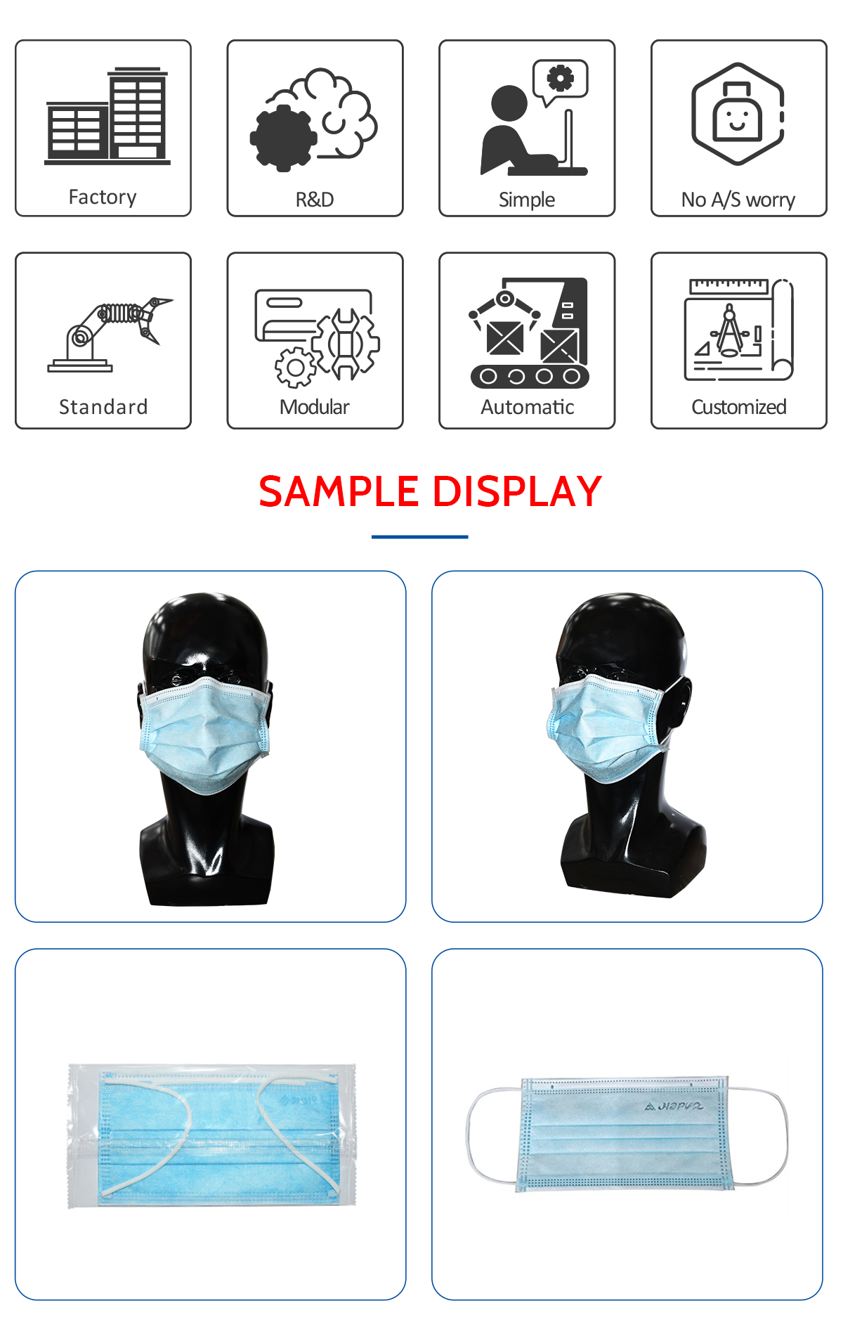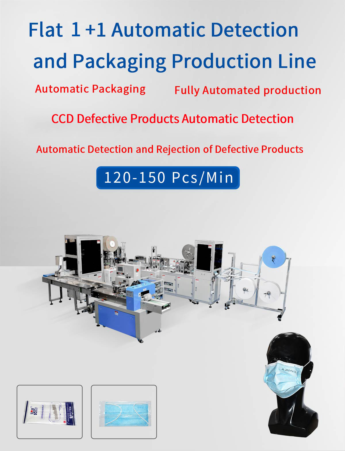 This machine is an automatic mask production line to produce the face mask and pack them automatically, with the function of visual inspection system and picking out defective products.The process is ···