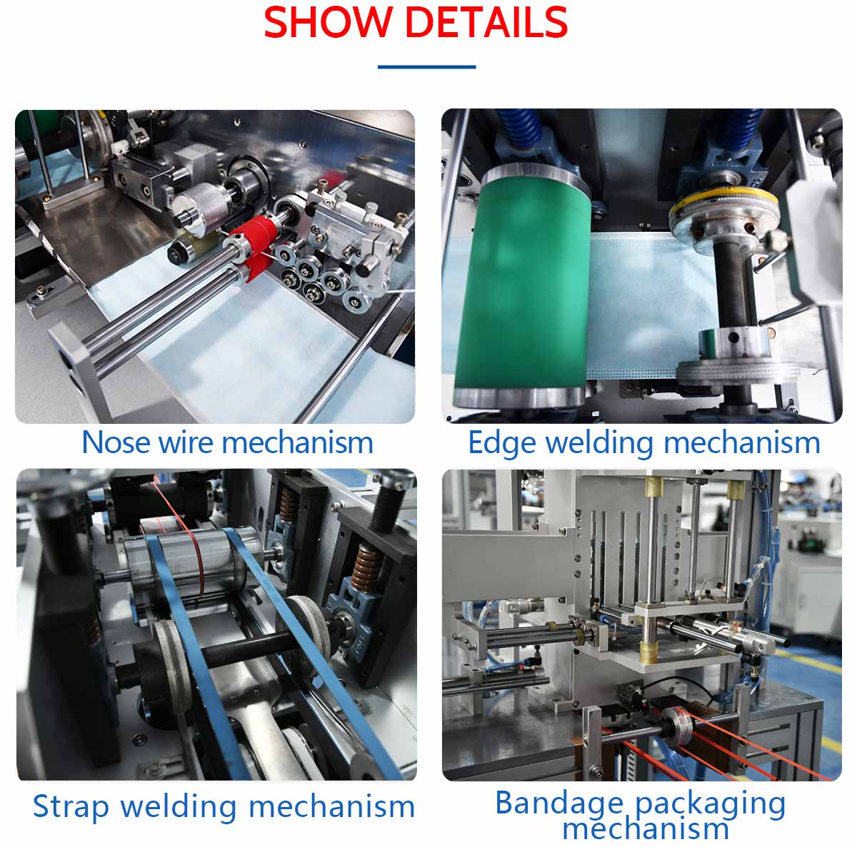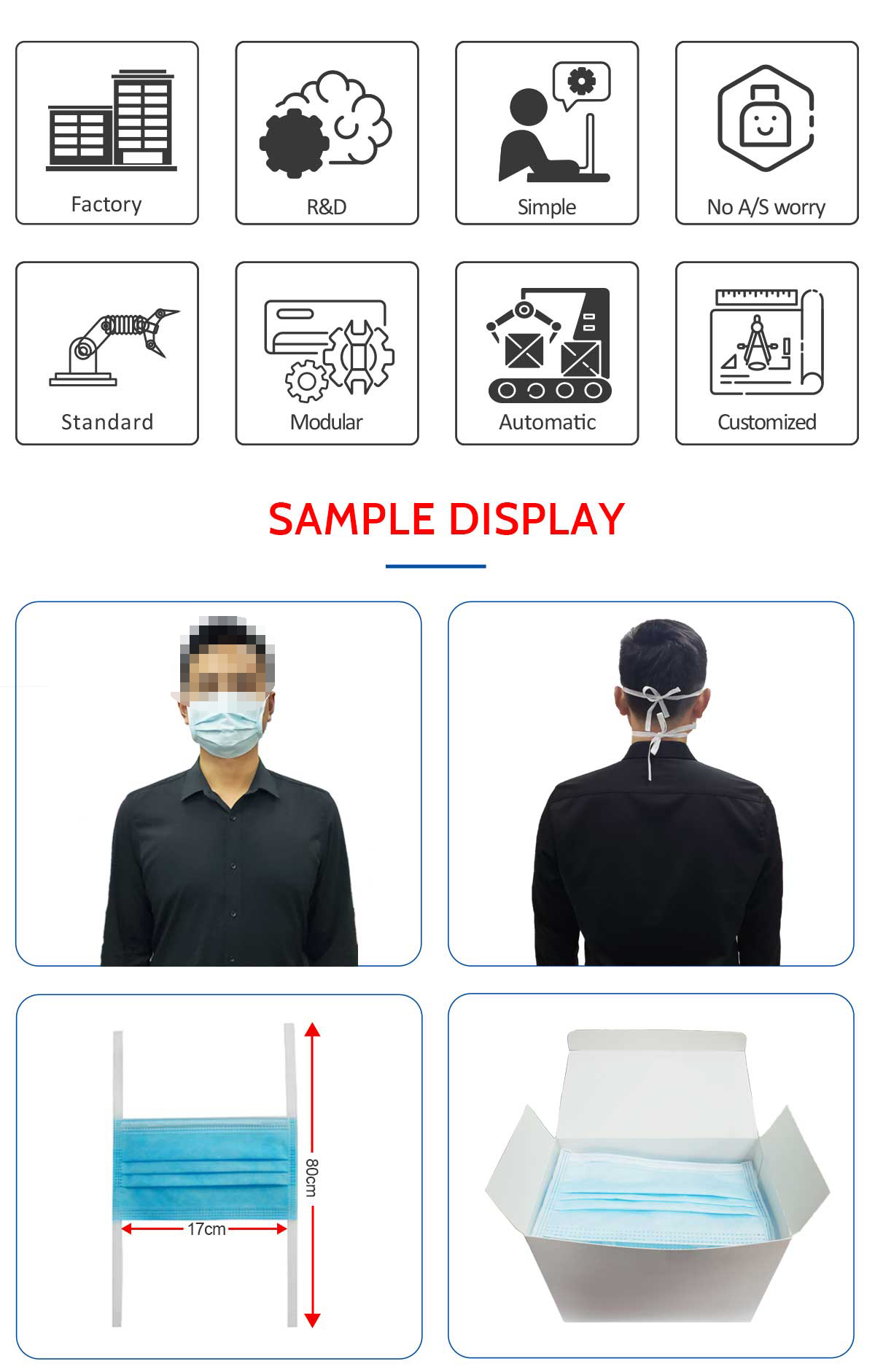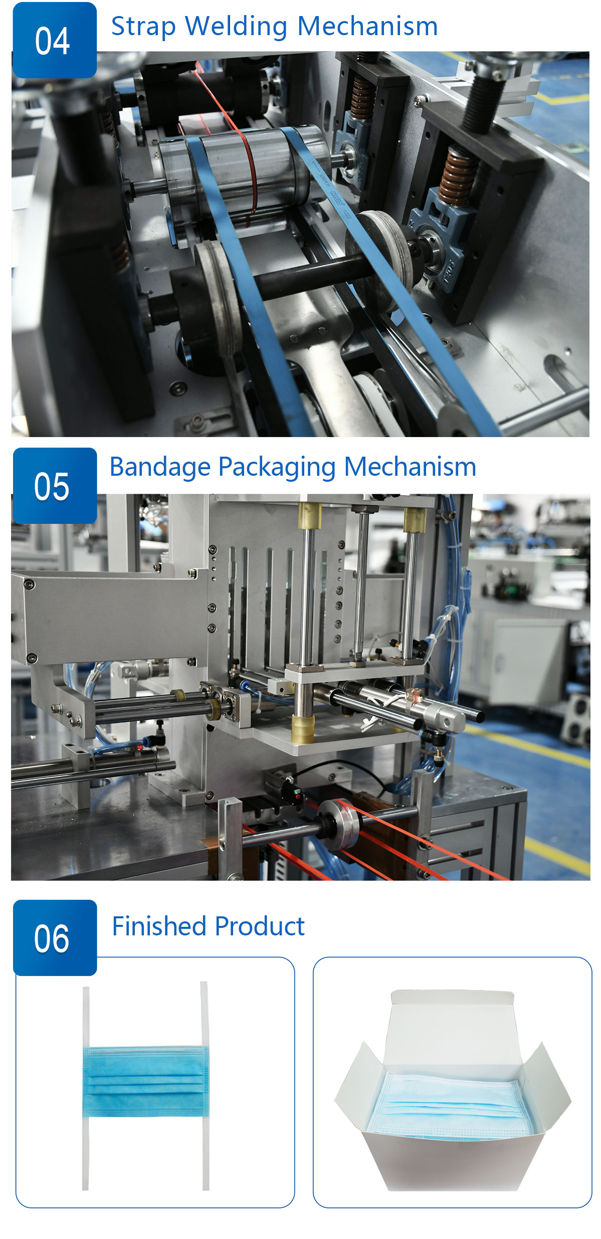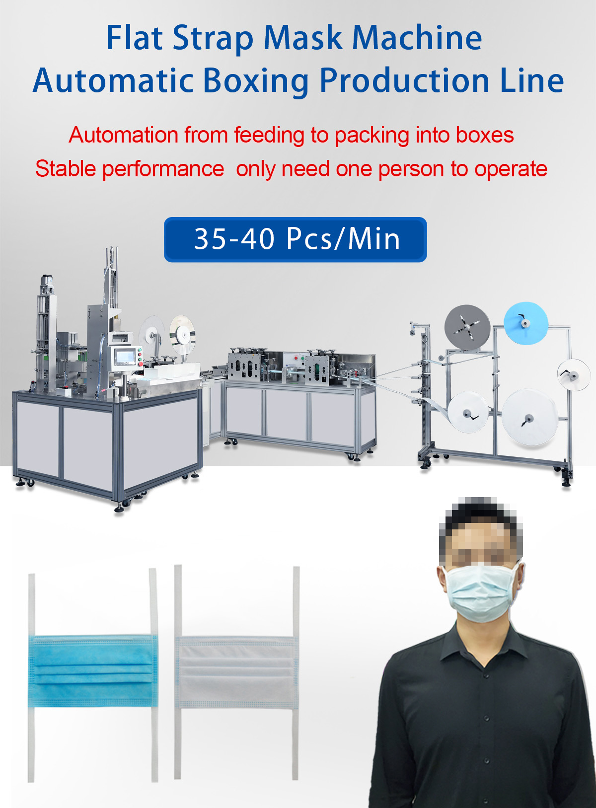 This machine is a fully automatic machine for the production of flat face masks with straps. It consists of a body and an ear strap machine. From the production of the mask body to the welding of the ear straps, the welding of the nose wire to the finished product and automatic boxing, it is all automatic, without manual operation. It is suitable for the production of flat face masks with straps.
