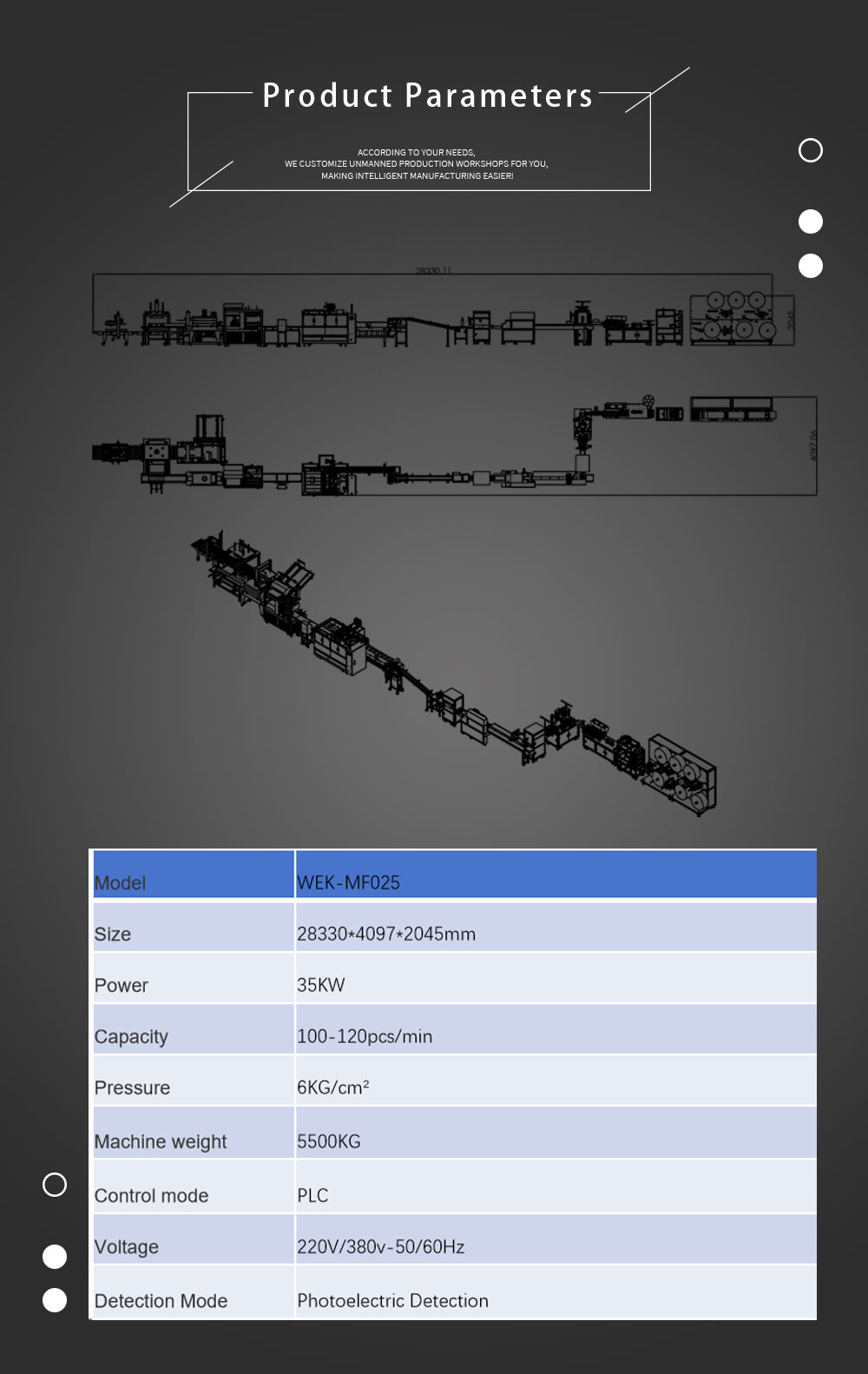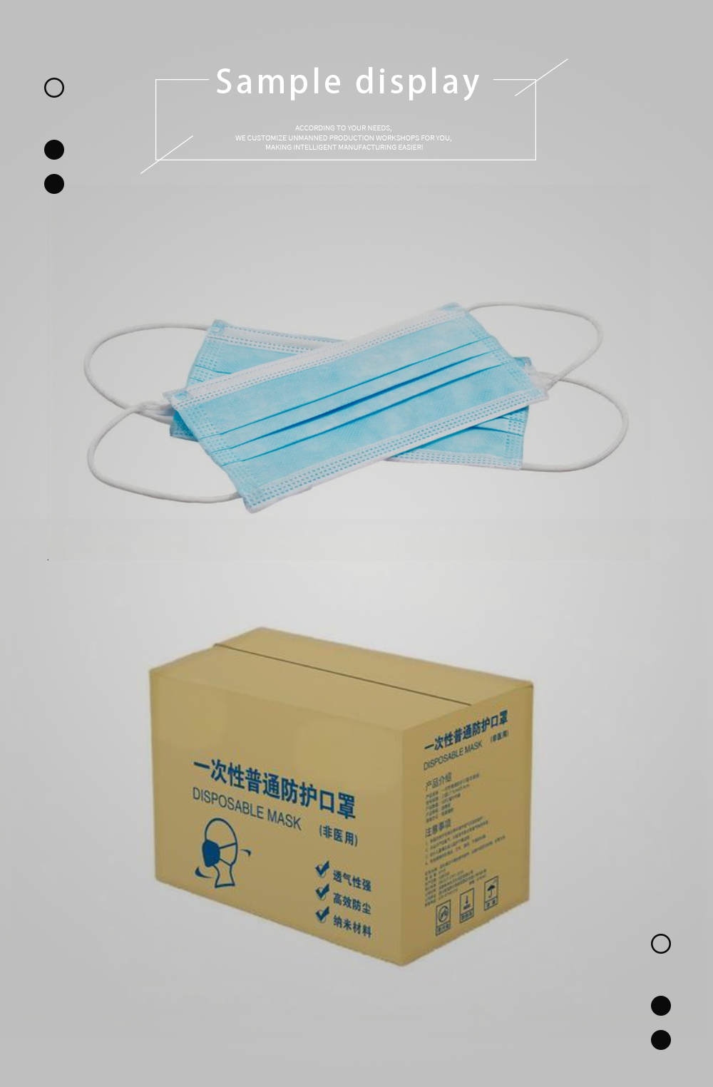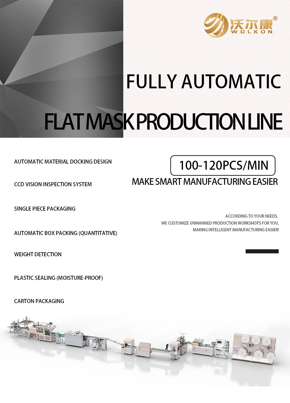 The fully automatic flat mask production and packaging line adopts an automatic material receiving and unloading rack design. When the material is exhausted, new materials are automatically connected without stopping the machine to change materials, thereby improving production capacity. The CCD visual inspection system detects material contamination, elastic band welding, nose bridge strips, packaging, etc. After the mask is produced, it enters the pillow packaging, and is plastic-sealed for single-piece packaging. 50 pieces (the number can be set) enter the cartoning machine for automatic boxing, and then enter the weighing and detection mechanism for plastic sealing and moisture-proofing. Then, the boxing and sealing are carried out. The entire production line can be unattended, and multiple mask machines can be connected to the packaging machine and the cartoning machine. It realizes an unmanned production workshop, improves production capacity, and saves labor.