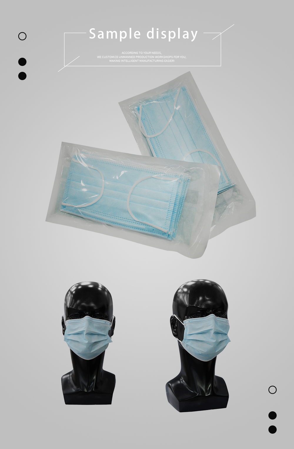 This machine is a flat mask machine that can automatically detect, remove defective products and automatically package. It uses 3-layer non-woven fabric as feed material and adopts a 6-layer material automatic material connection design. From the production of the mask body to the welding of the nose line, the welding of the ear straps and the packaging of the finished product, it is all automated and suitable for the production of outer ear strap masks. It is also equipped with an automatic detection device to ensure the qualified rate of the finished product. The packaging method is bag-type packaging. During the packaging process, material picking, bag opening, bagging and sealing are all completed automatically.