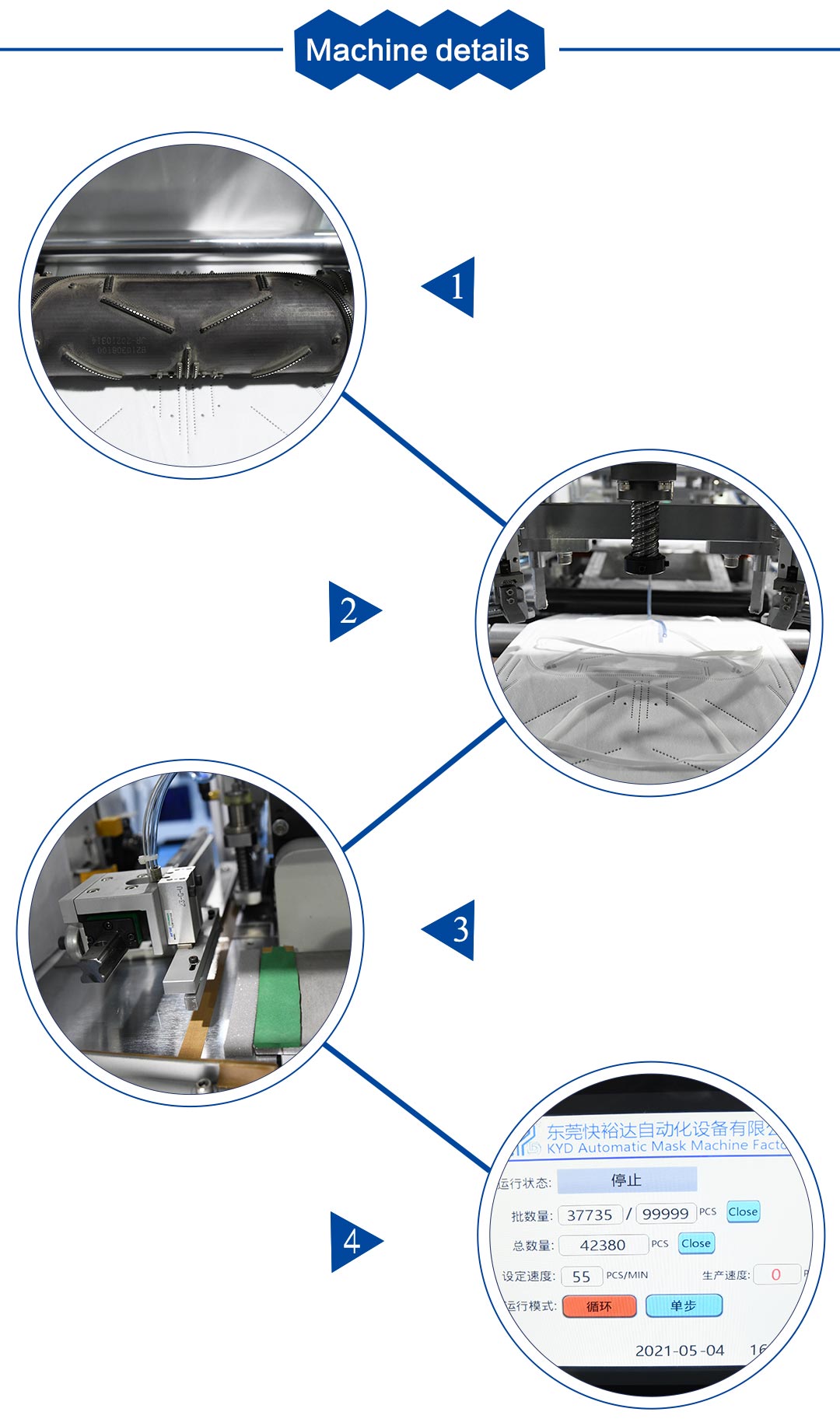 This machine is a fully automatic machine to produce head-strap folding type mask. The process is from raw material feeding, head band welding, nose wire welding to the finished 9200product.PLC control and high stability.