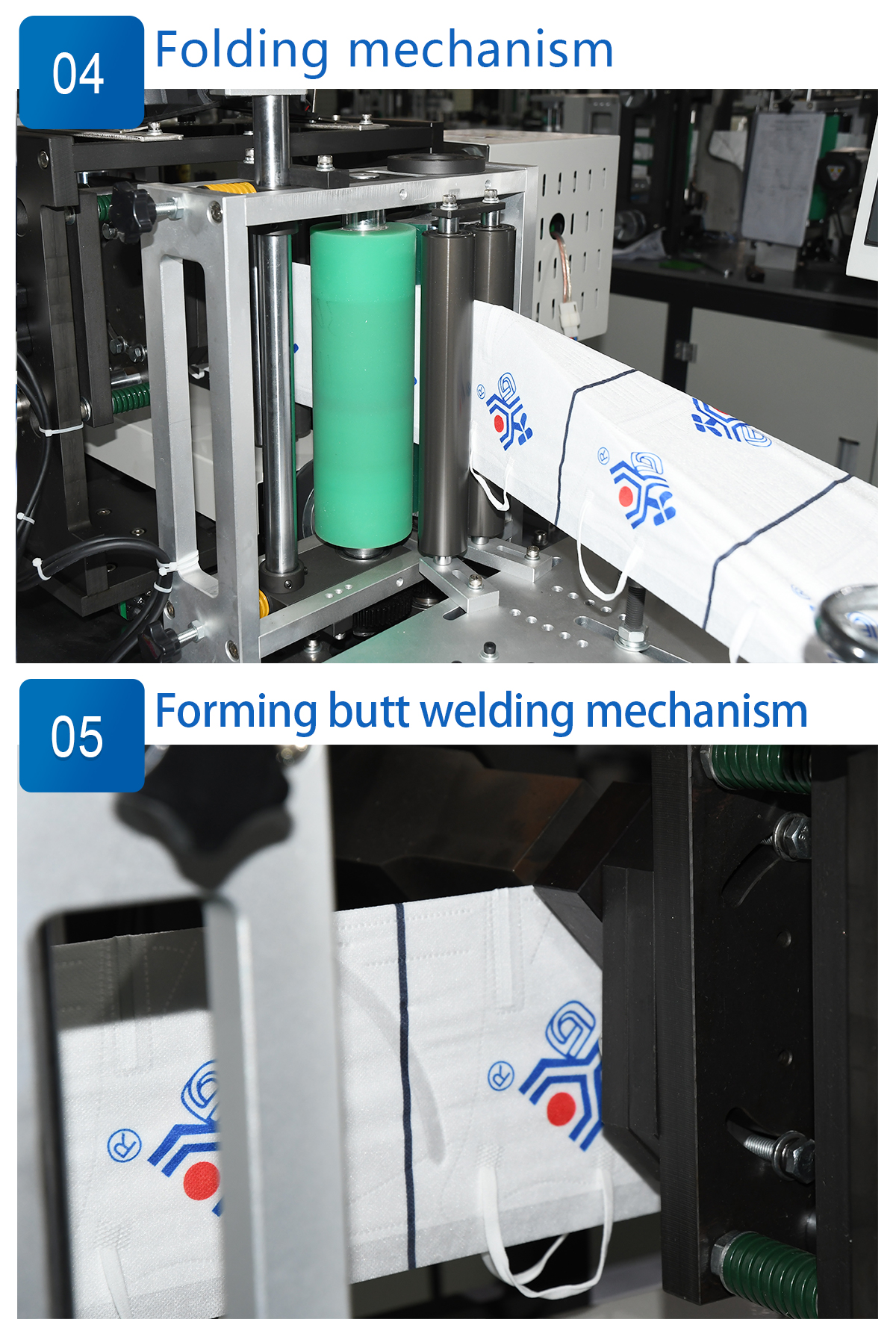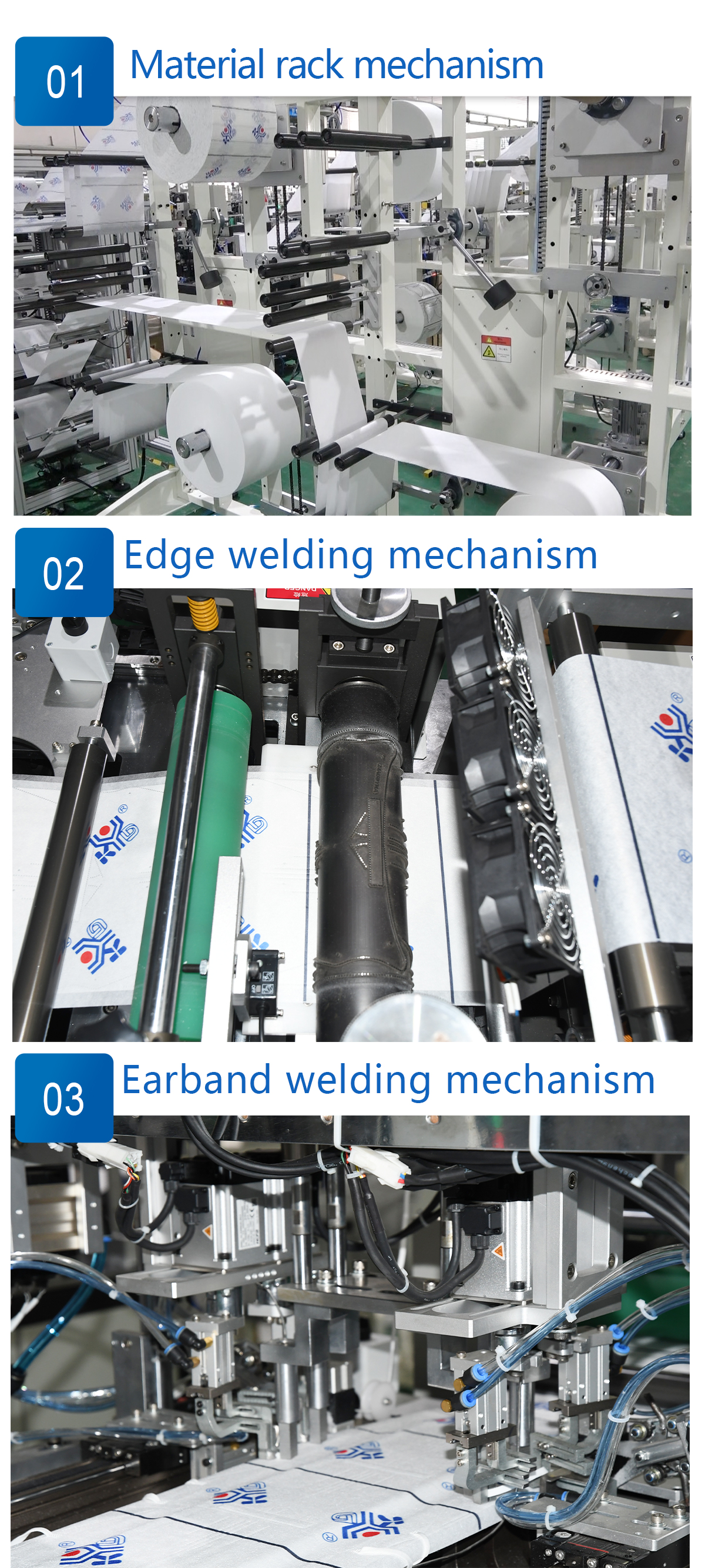This machine realizes the automatic production of KN95 masks of printed fabrics through the color code positioning device, with high positioning accuracy, and realizes automatic high-speed production of folded masks from feeding to finished product conveying, including built-in nose line, built-in sponge strips, and spot welding of ear straps , Mask molding, and printing functions only need one person to operate and save material costs.