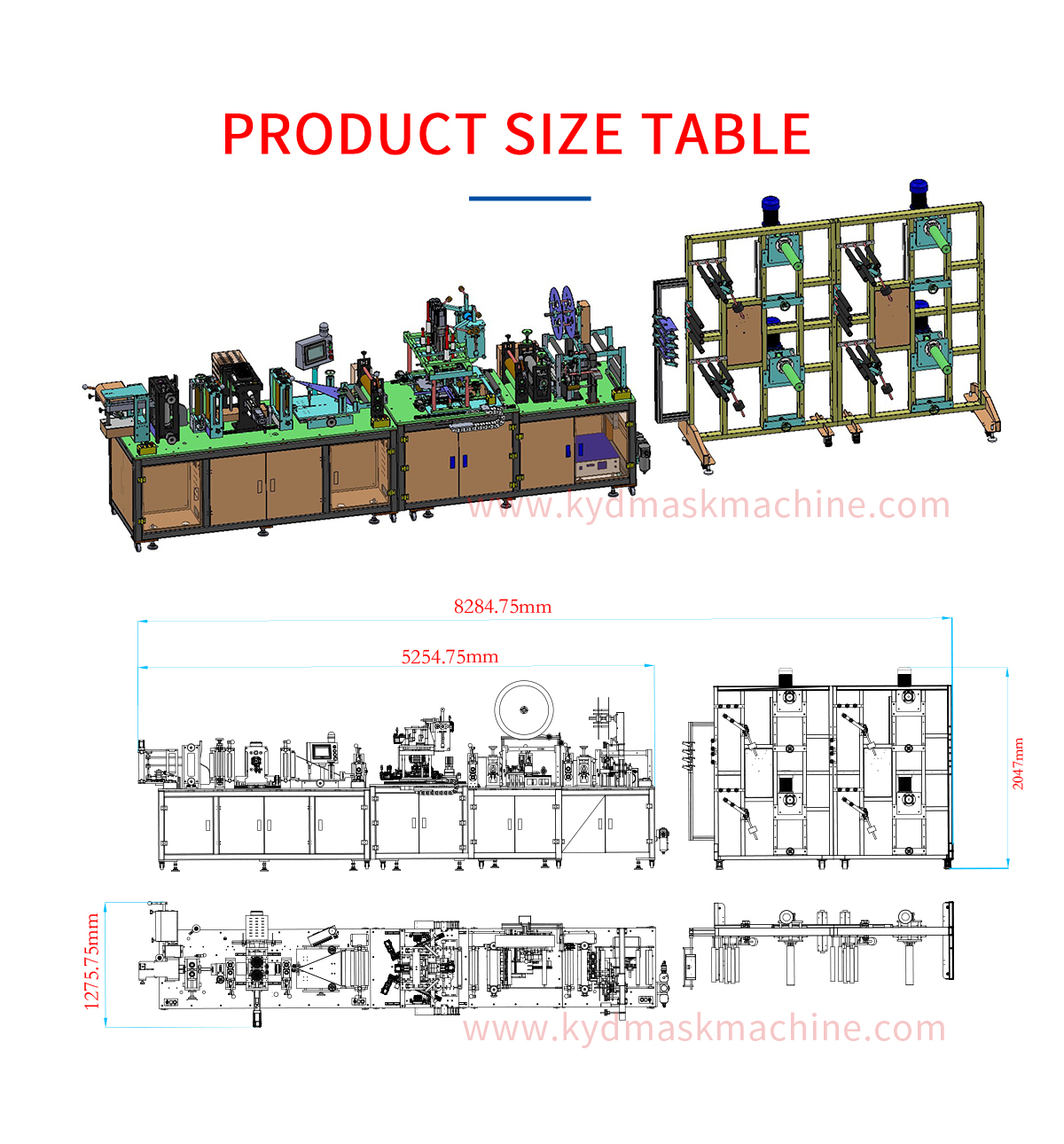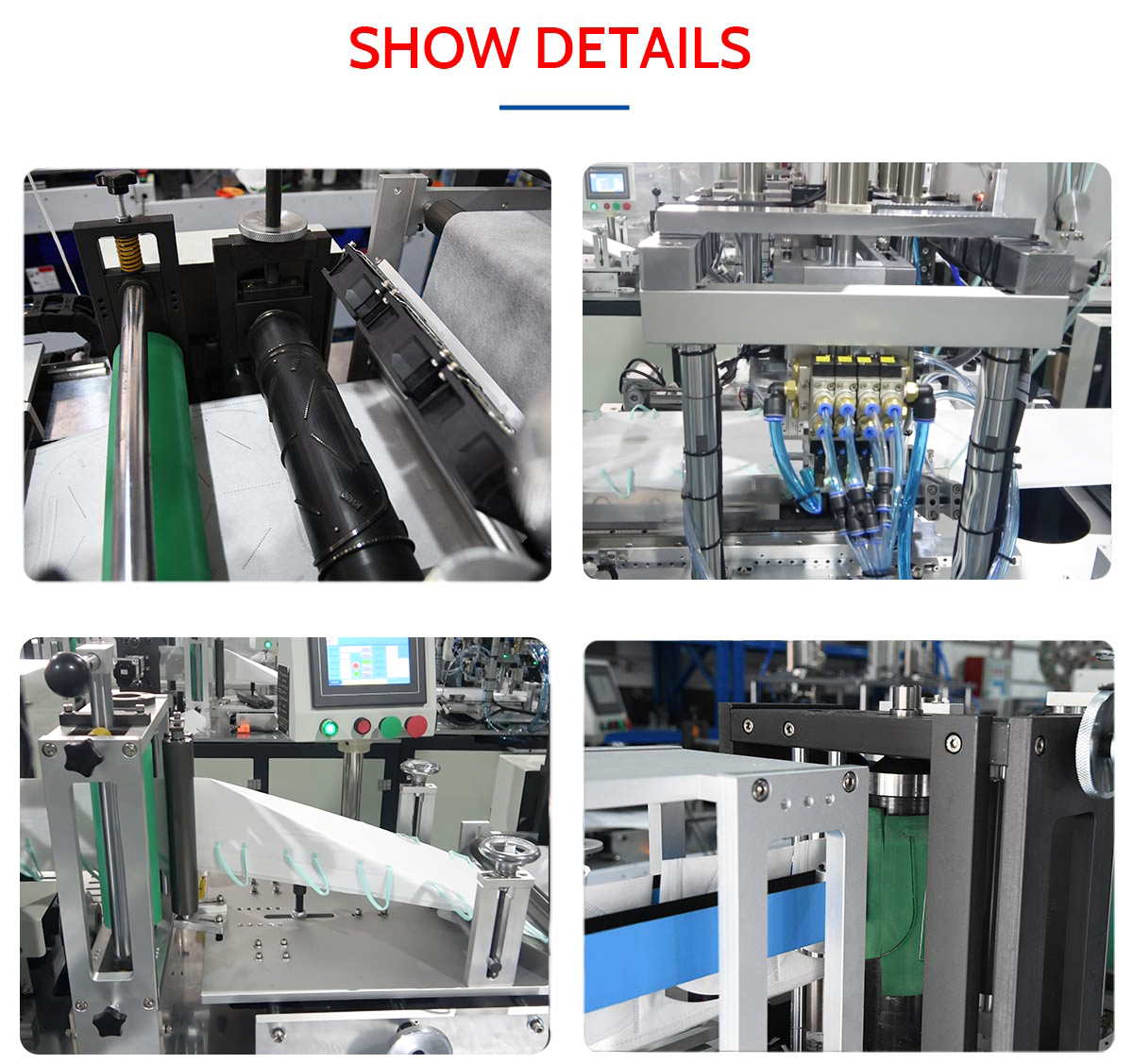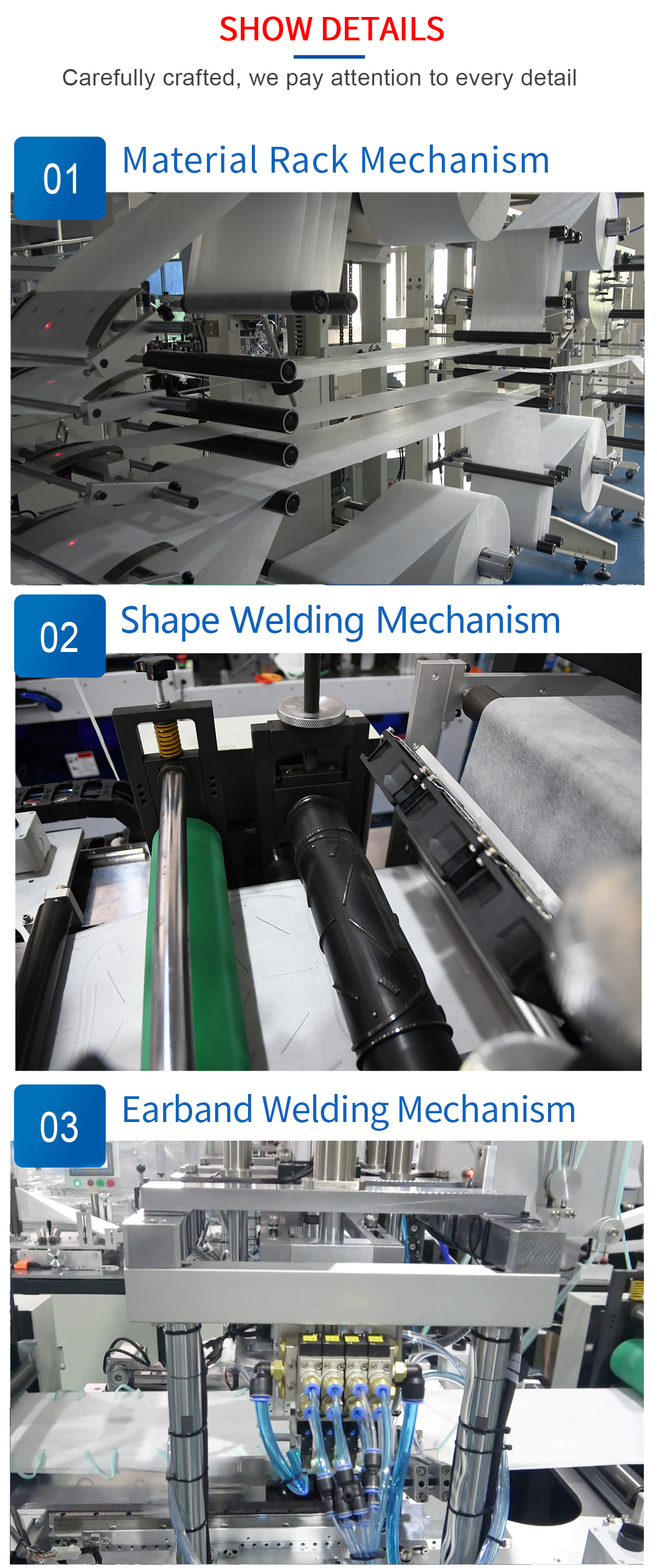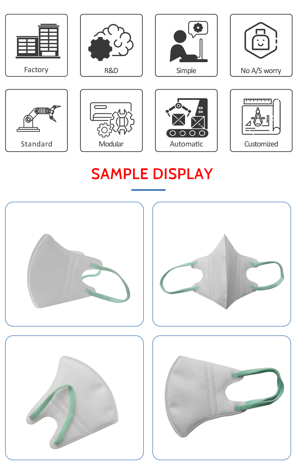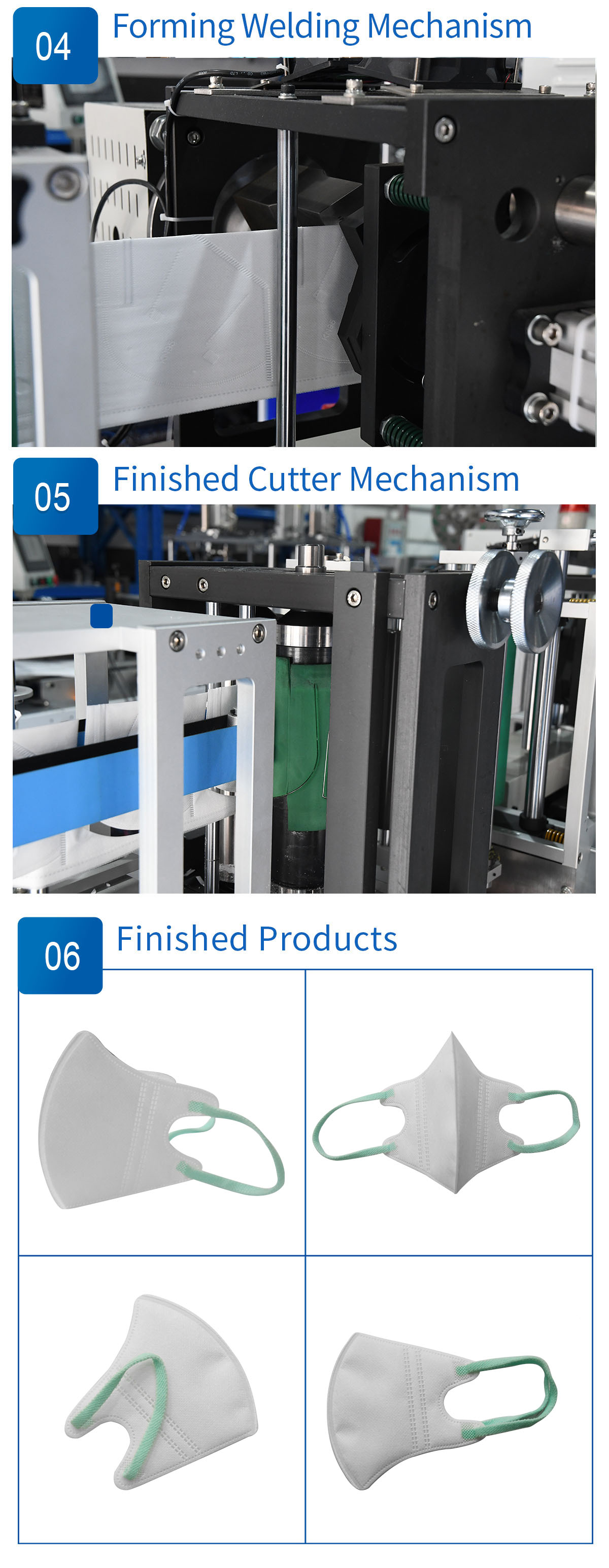 This machine is a fully automatic machine to produce the duckbill mask body. From the material feeding to the finished mask body automatically completed , included installing nose wire,printing, punching the breathing valve hole, forming welding and cutter, counting collection fully automatic.