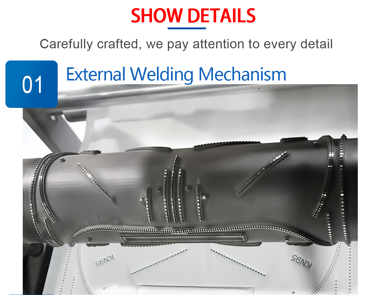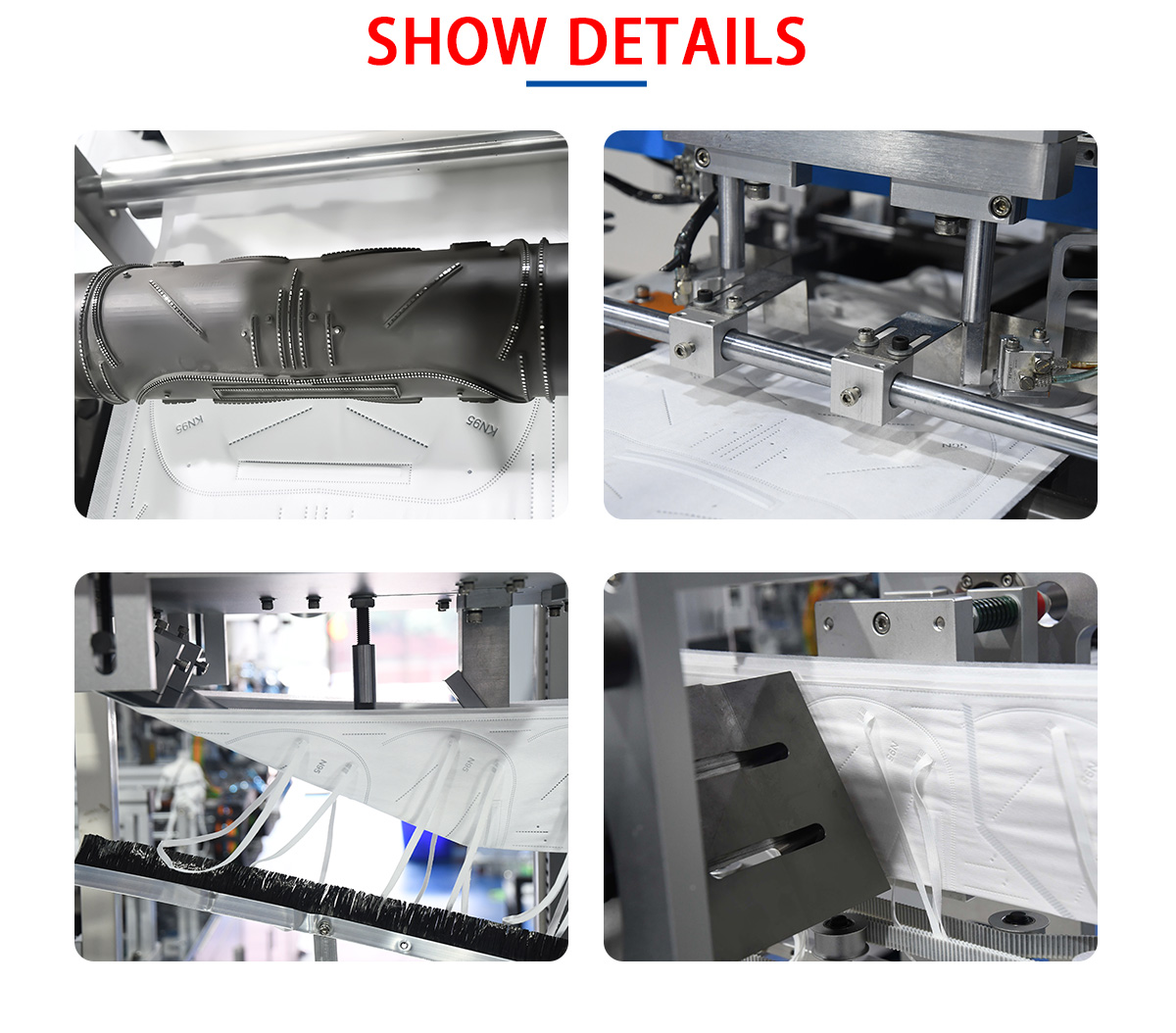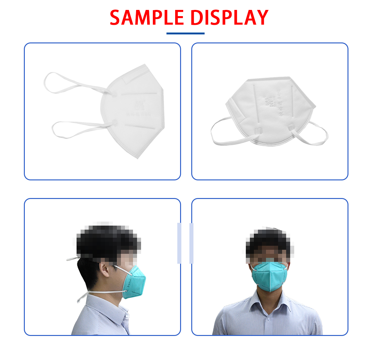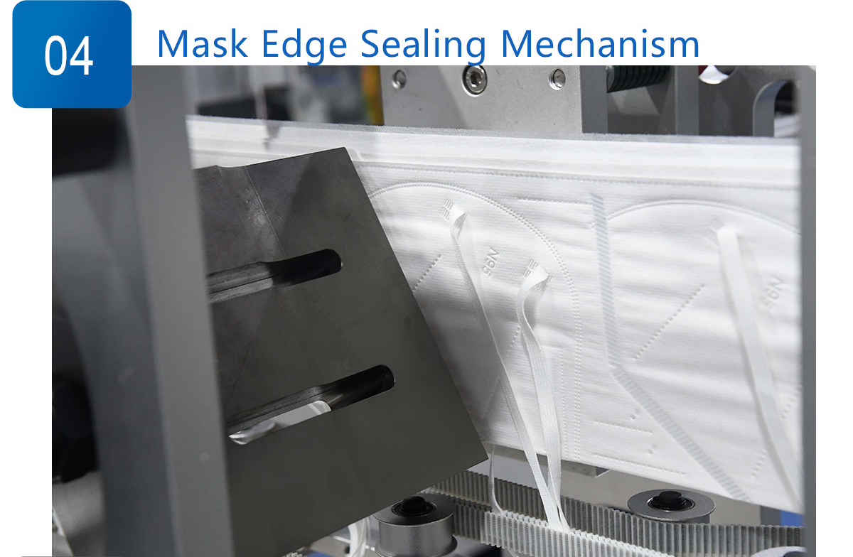 This machine realizes automatic high-speed production of 380-500mm long-head hanging folding masks from material feeding to finished product delivery, including built-in nose wire, ear strap spot welding, mask forming, and printing functions, which only need one person to operate and save material costs.