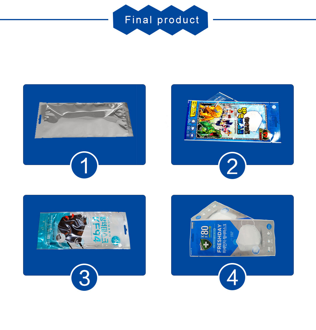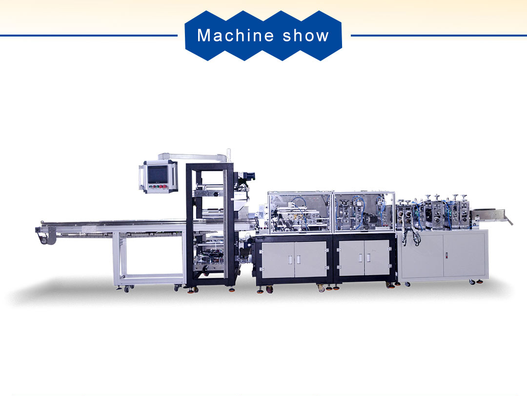 PLC control, touch interface, parameter setting convenient and fast, independent temperature control system, It has synchronization, fixed length, positioning speed , automatic fault diagnosis function. This machine’s raw matenial is film, the function includes making the plastic bag and packing masks into the bags,opening and hanging holes. Packaging size can be customized according to customer's requirements.
