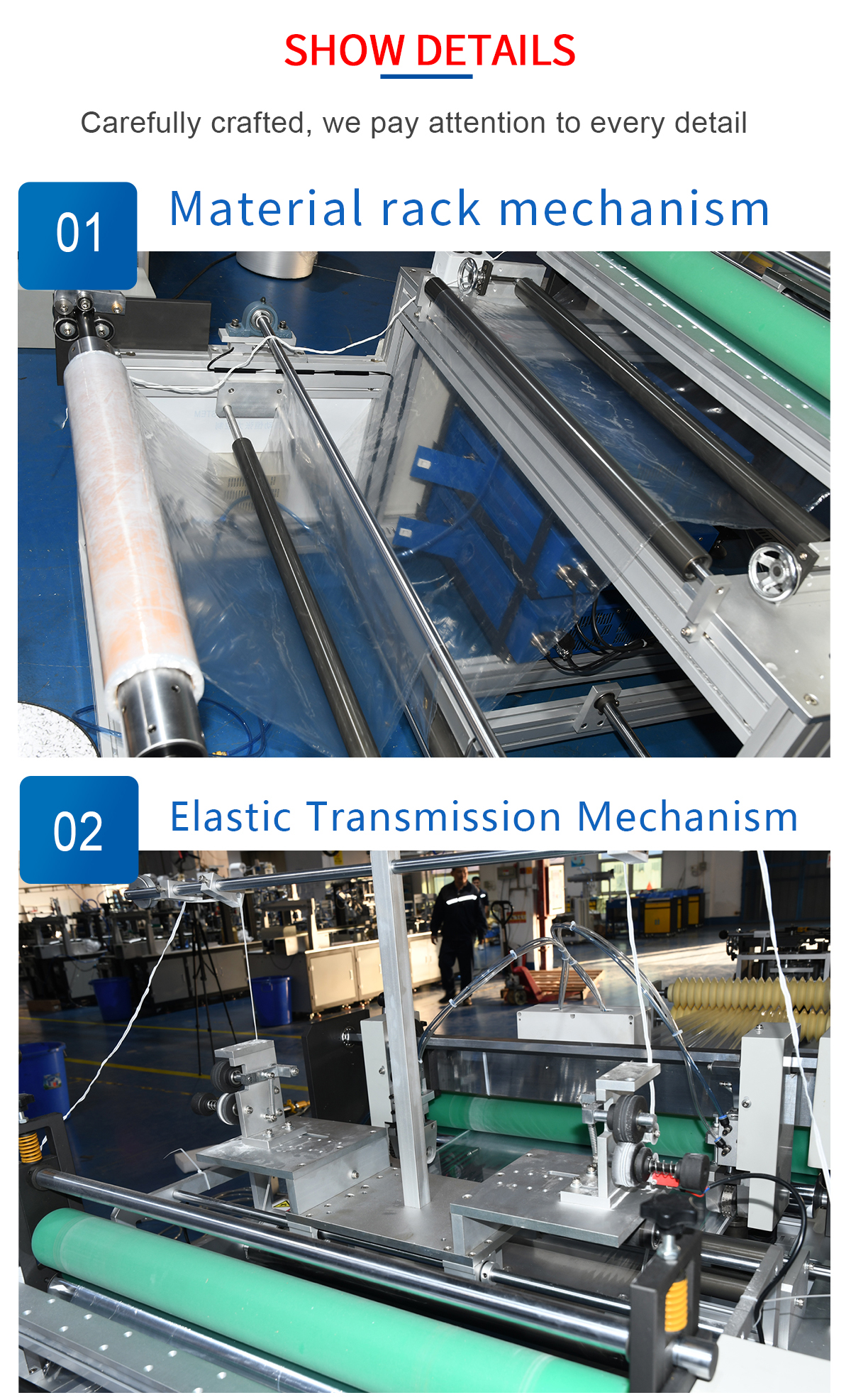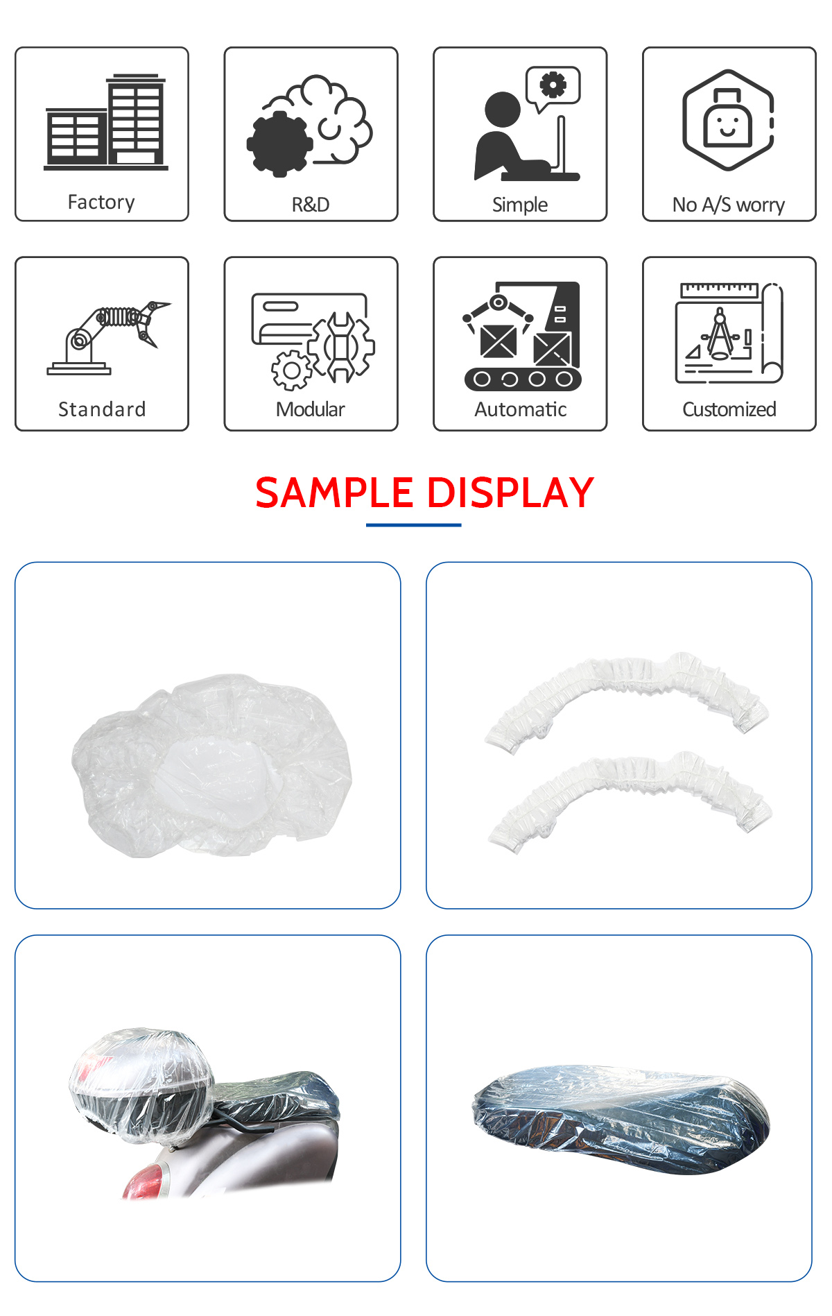 This machine is a fully automatic production equipment for PE dust jackets. The products are mainly used in dust-proofing of major appliances, seat cushions of motorcycles or electric vehicles, and dust-proofing of steering wheels, etc. It only needs one person to operate from the feeding to the collection of finished products, the operation is simple, and the performance is stable.