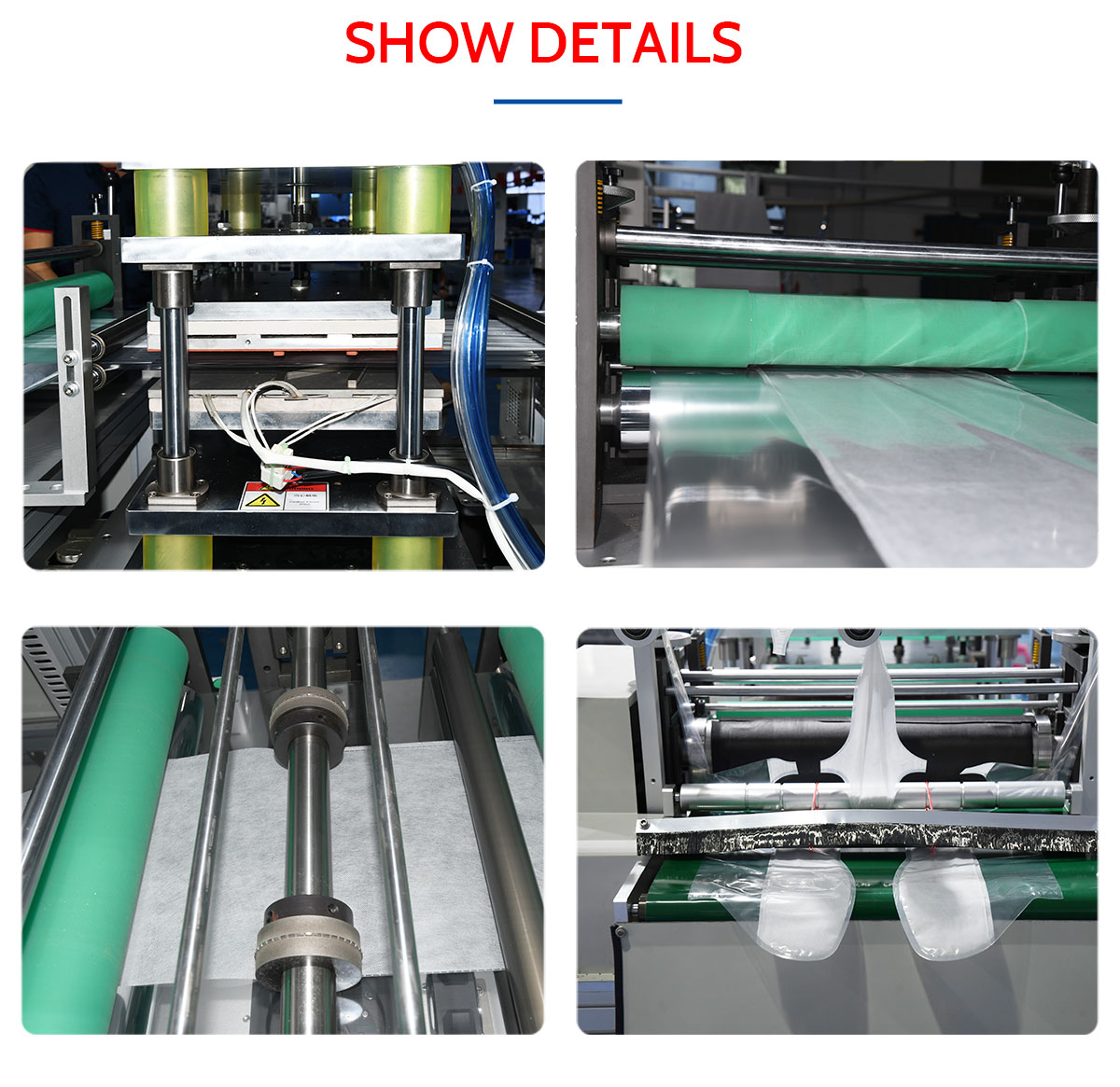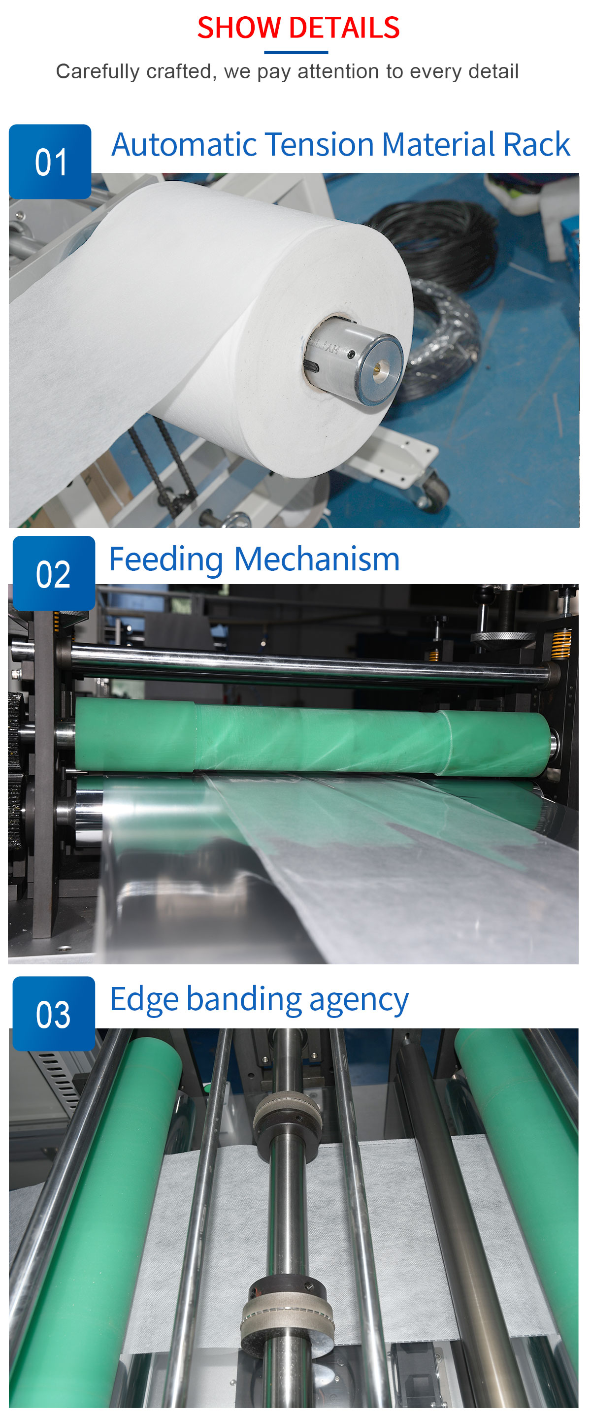 This machine is a hand mask and foot mask manufacturing machine. From raw materials to finished products, one-time completion. The panel is hardened. PLC microcomputer control, automatic tension control system system runs more stable.