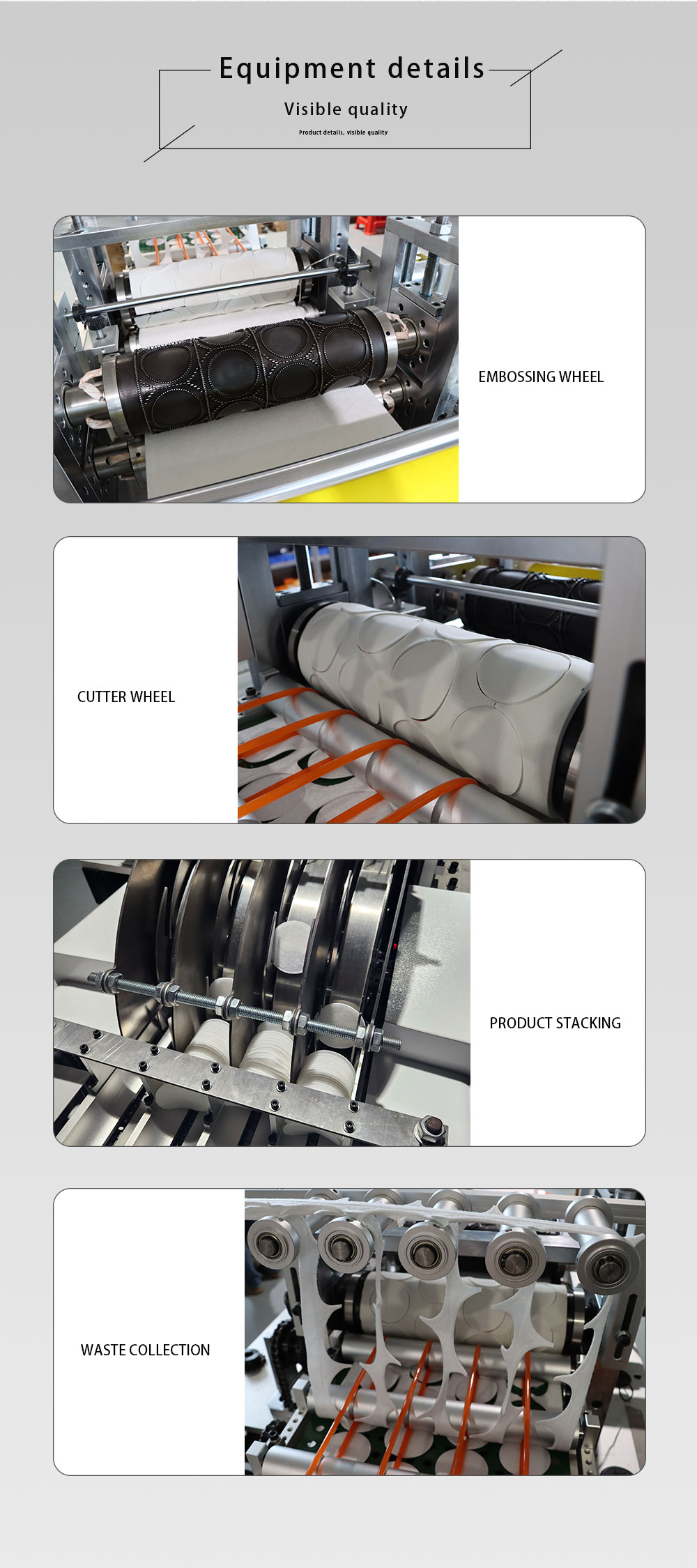 This machine is a fully automatic machine specializing in the production of pure cotton spunlace cloth inserting (unloading) makeup cotton. The equipment is fully automatic from raw materials, transportation, cutting, waste rewinding to arrangement and discharging of finished products. Different patterns can be customized according to customer requirements. The equipment adopts the most constant oil temperature heating and the most stable mechanical cold cutting method, and discharges the finish