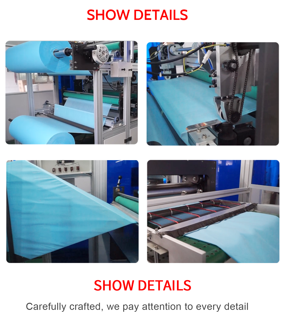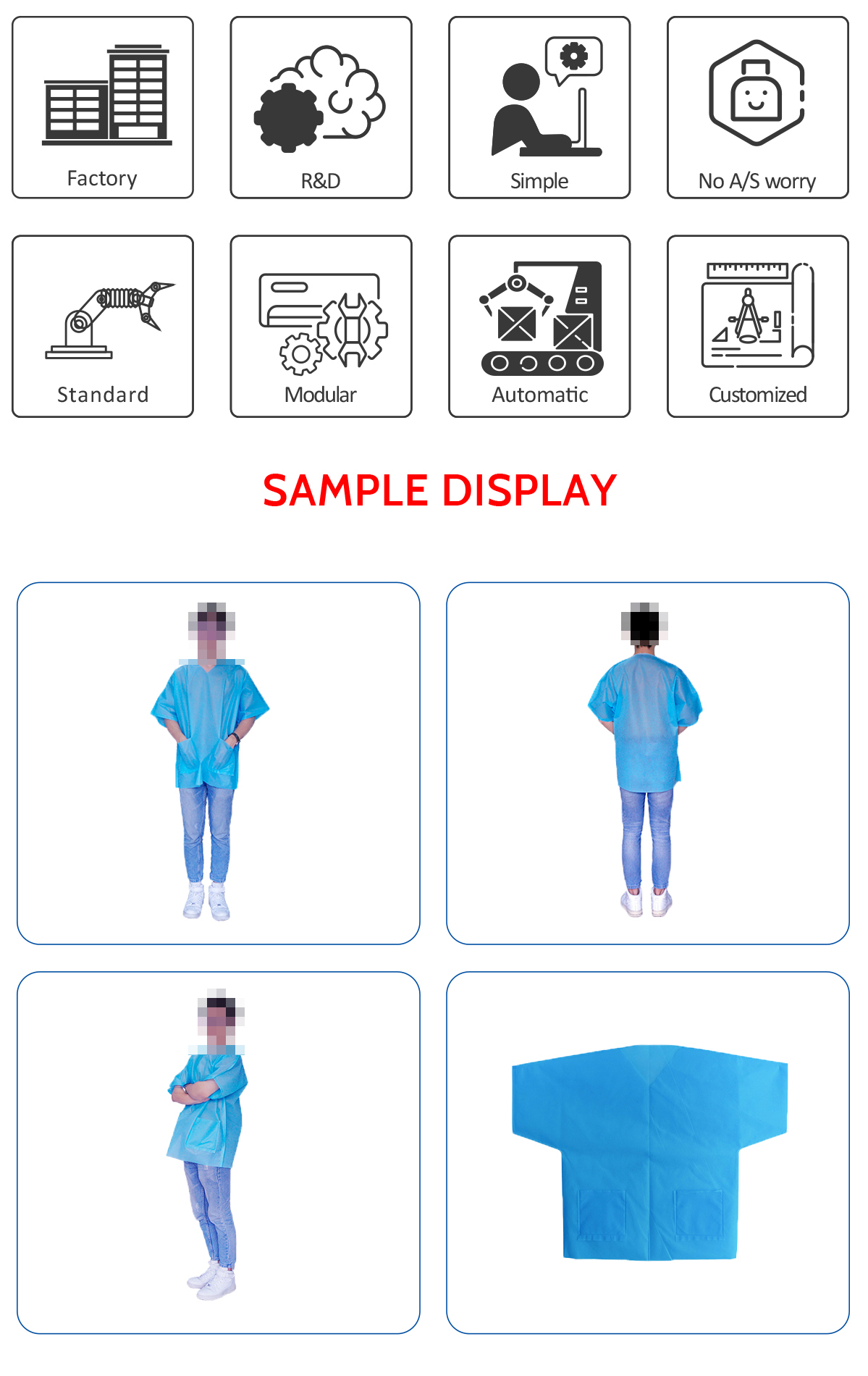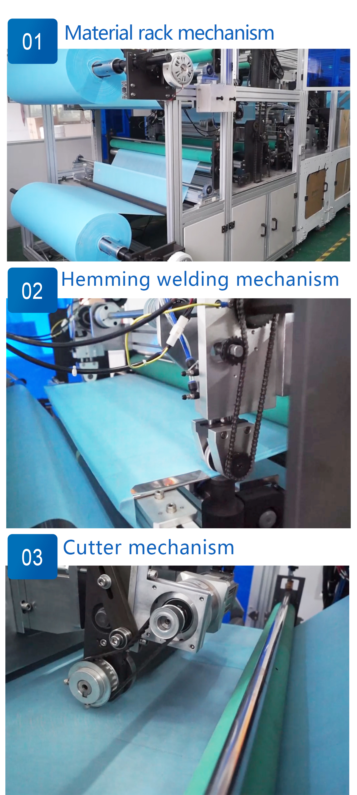 This is a fully automatic machine to produce the disposable non woven scrub gown.The process is from raw material feeding,collar welding,pocket welding to waist welding and cutting.The scrub gown can by fully produced in one machine, and it only requires one worker to operate.