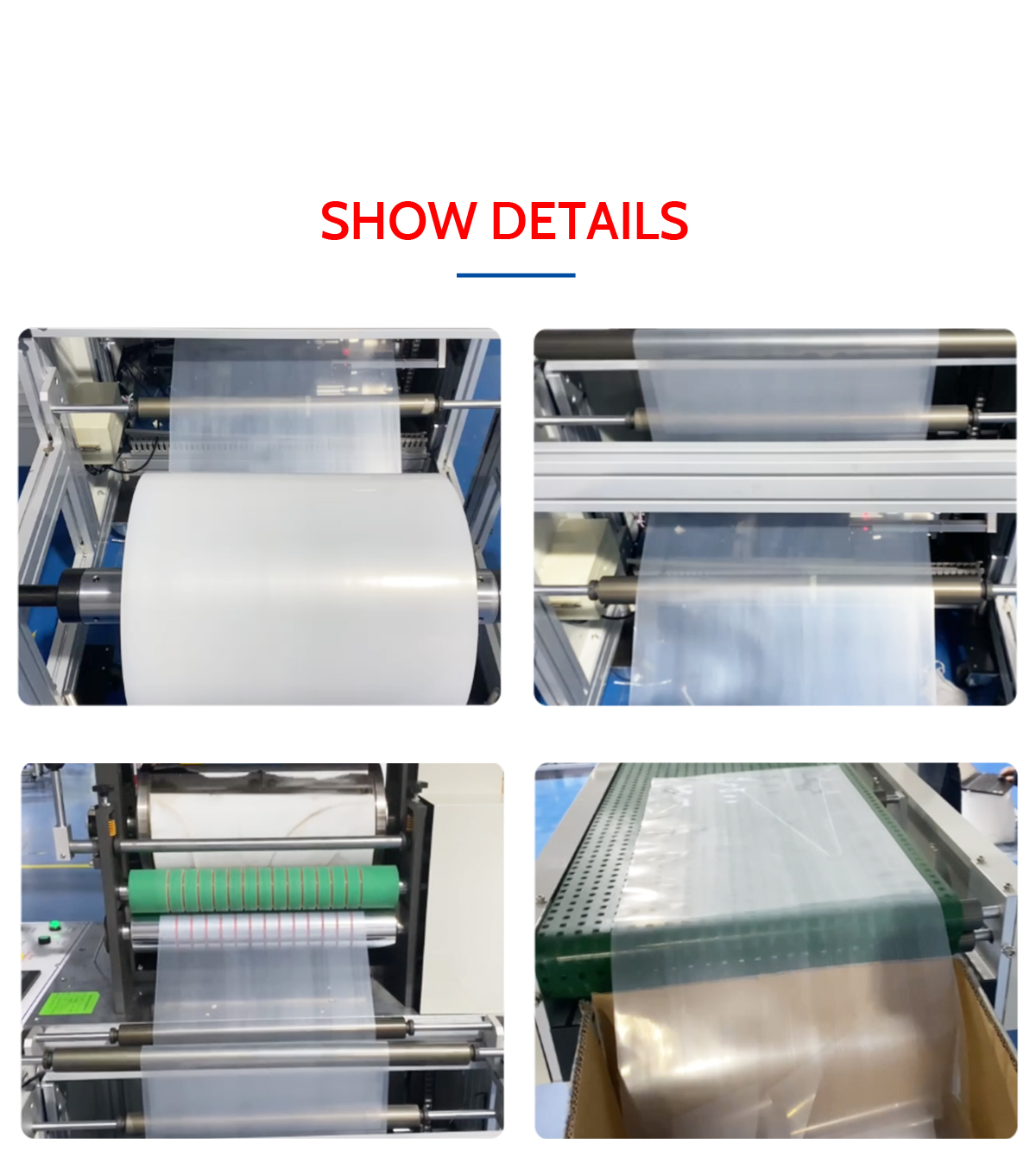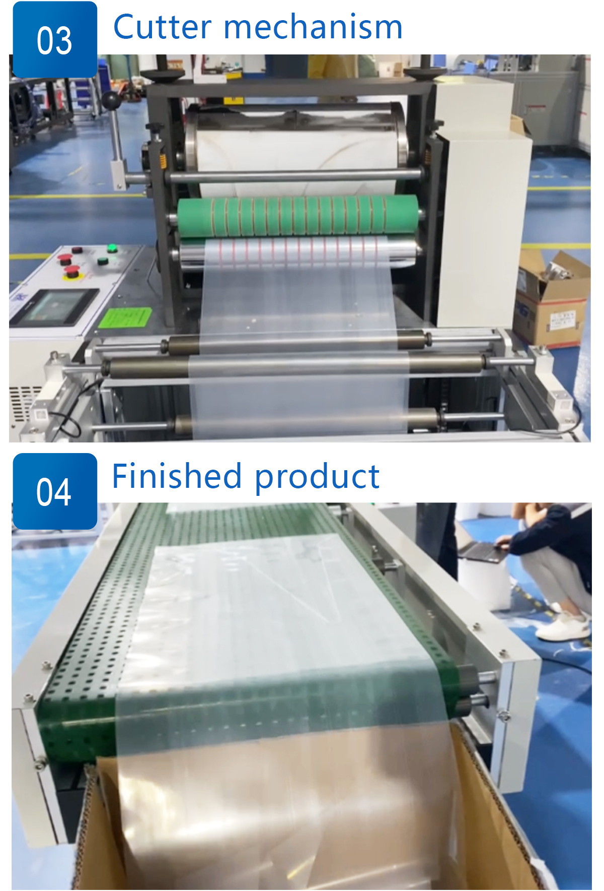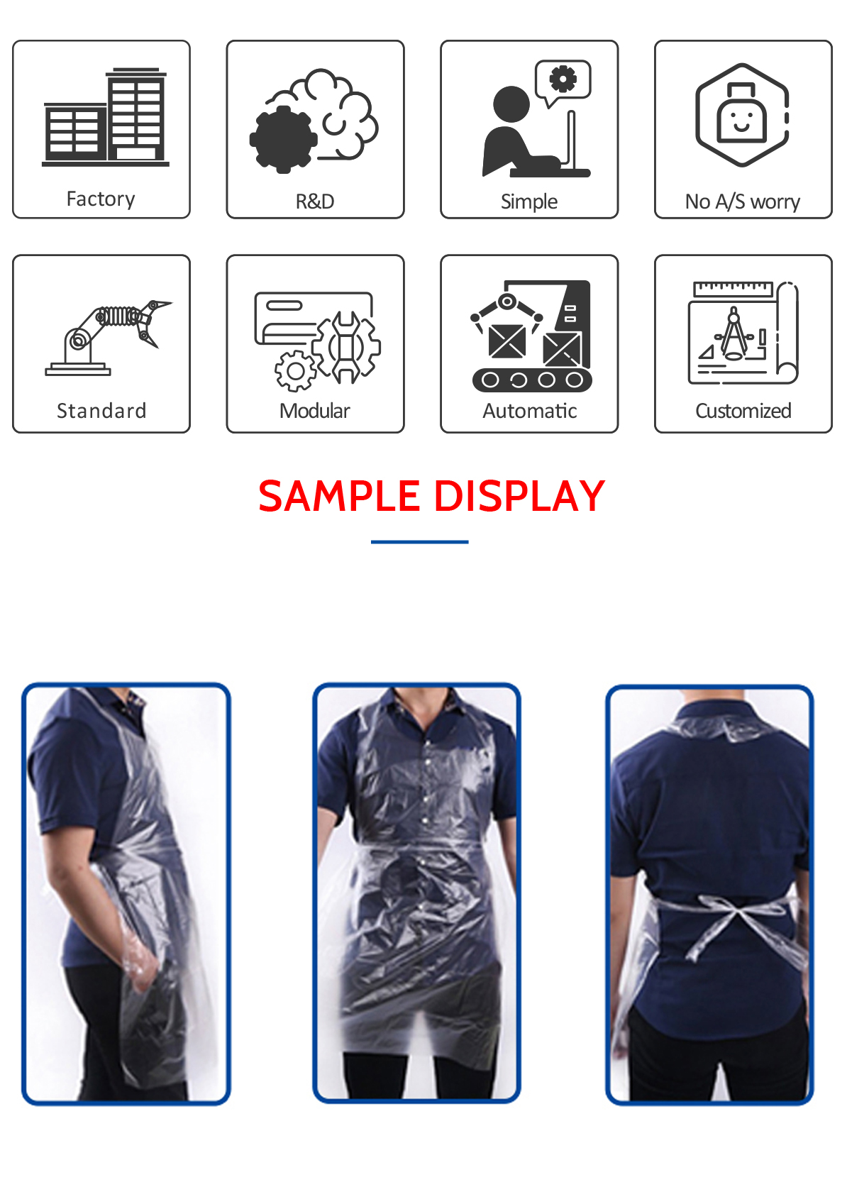 This machine can produce disposable PE apron. The process is from film material to finished product. PLC control, high stability.