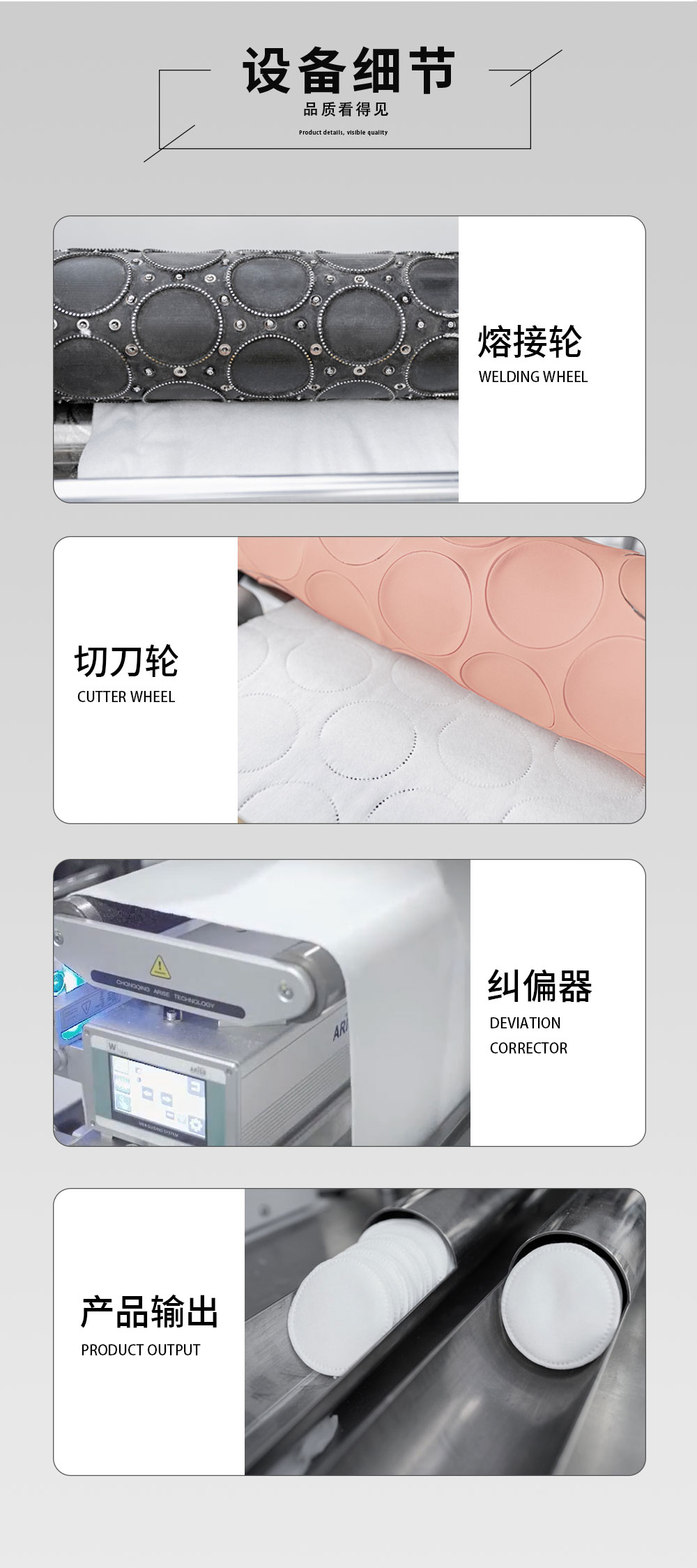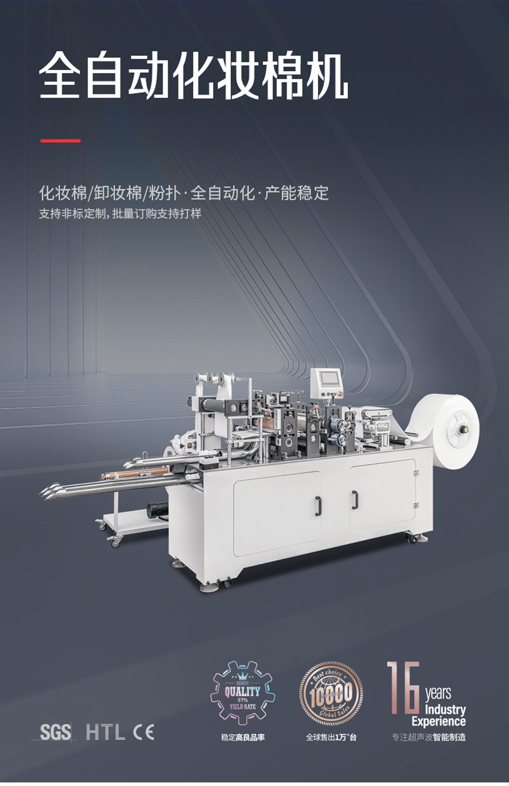 本机是生产卸化妆棉全自动化设备。女士卸妆、化妆棉、粉扑制造设备,全自动化机械,性能稳定,速度高,适用于美容日化,旅游酒店行业。